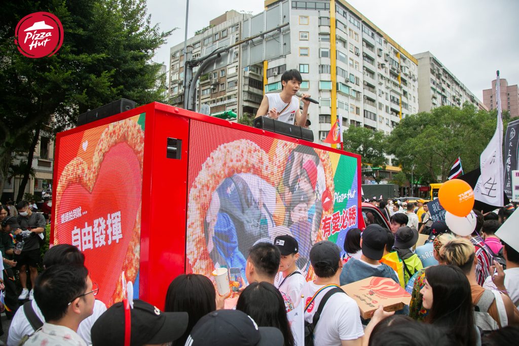 必勝客首次與「臺灣彩虹公民行動協會」官方合作,打造全台唯一「Love Cam 遊行車」,讓同志遊行成為公開傳遞愛的舞台。對花車鏡頭大聲說出想說的話,就能獲得必勝客大比薩兌換券 1 張;遊行時現場追蹤必勝客官方社群帳號(FB 或IG)更可獲得彩虹應援扇、必勝客優惠券等;而彩虹市集也有滿滿活動,於市集追蹤拍照打卡更可獲得彩虹應援扇以及切片美式臘腸愛心比薩1片(活動贈品數量有限,送完為止!)!必勝客邀請大家大方說愛,無論何時何地,都能與所愛的人共享幸福滋味,和我們一起有愛必勝!