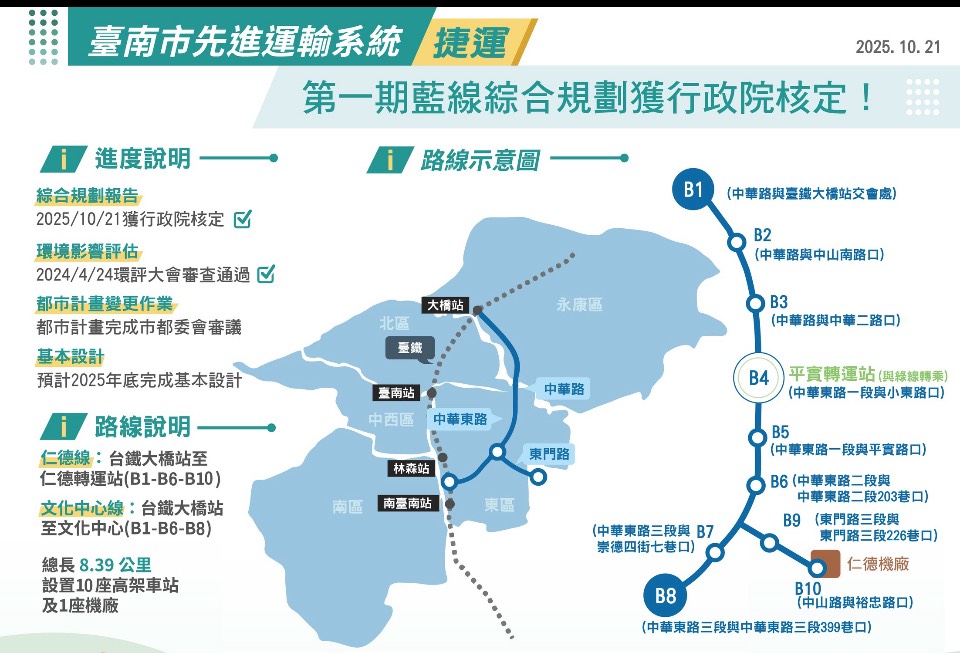 台南市長黃偉哲表示,市府多年來積極爭取的首條捷運藍線,全長約八點三九公里,北起大橋,南至文化中心,支線則連接仁德機廠,行經東、永康、仁德區,都是精華地段,更是串聯未來第一期藍線延伸線、綠線及紅線等路線的核心路線,隨著綜規核定,象徵宣告台南捷運建設及城市發展的新紀元就此正式展開。
