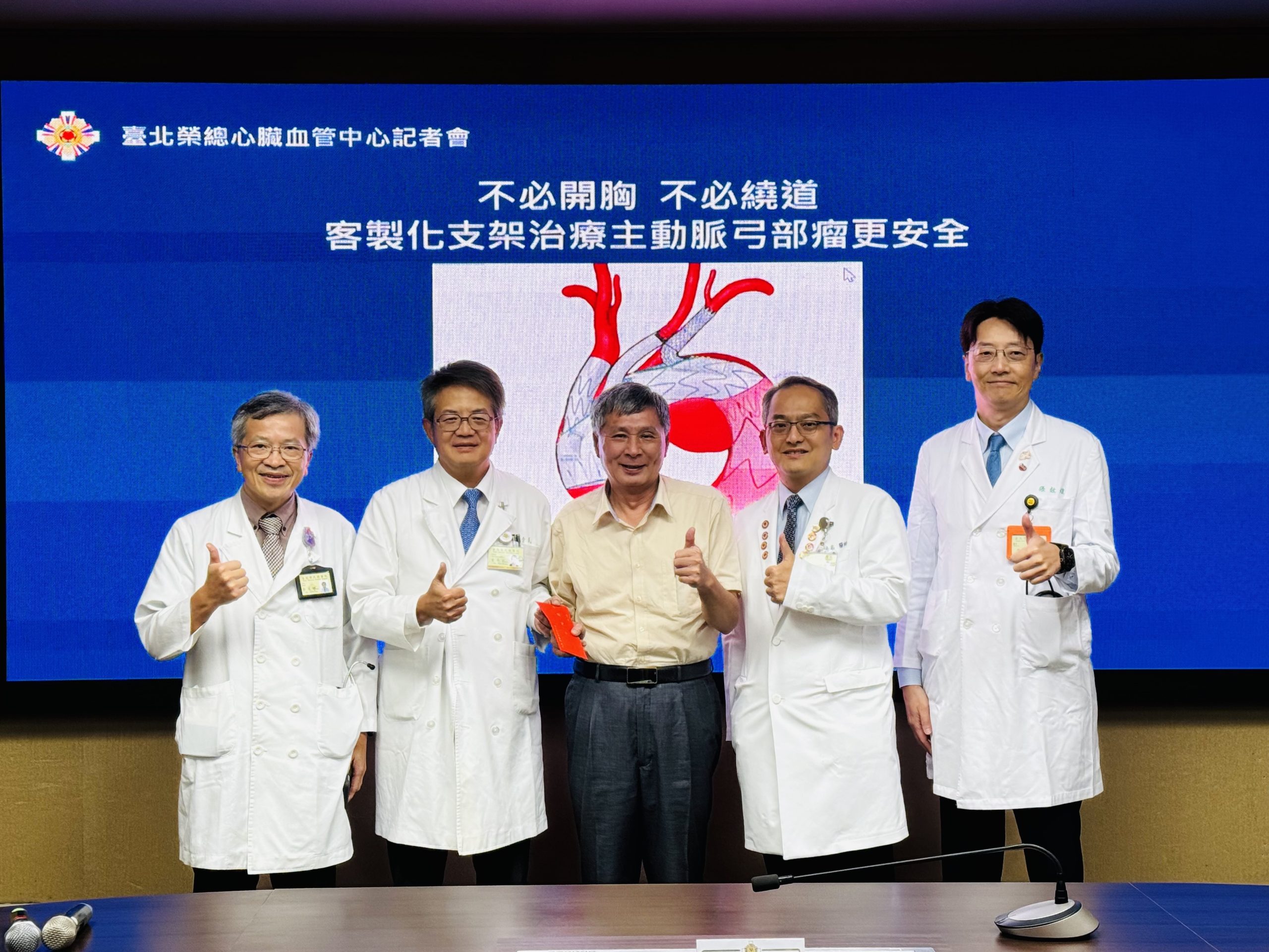 一名63歲男性,過去曾因主動脈剝離接受傳統開放式胸主動脈置換手術,後續追蹤發現弓部動脈瘤逐漸增至8公分,接近通往腦部的3條重要血管分支,但由於是二次開胸,手術風險高。北榮團隊利用率先引進的「客製化胸主動脈開窗支架」,不必繞道且依病人主動脈態樣量身訂做支架,順利完成手術。