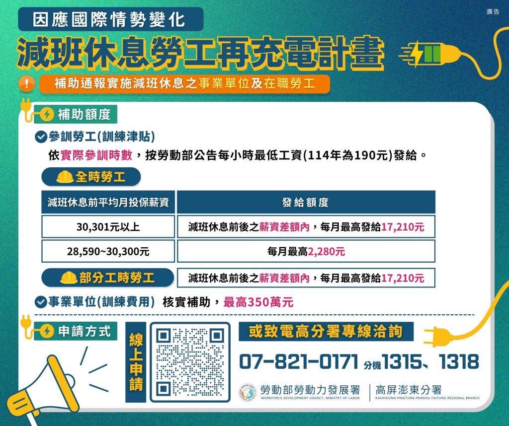高分署署長郭耿華表示,轄區內經勞資協議實施減班休息之事業單位或勞工,分署將立即啟動關懷輔導機制,提供個案化協助方案,符合資格者可透過補助企業辦理員工訓練計畫網(https://gov.tw/r7q)線上申請,或致電高分署諮詢專線07-8210171轉1318查詢。
