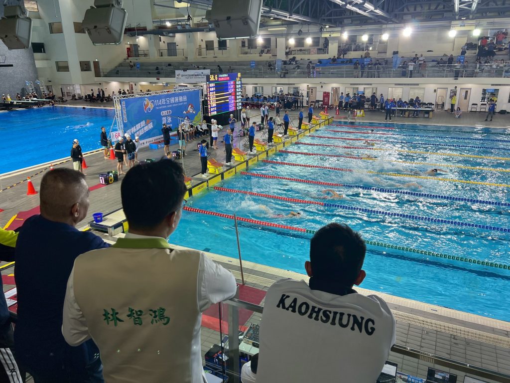 林智鴻見證選手們在泳道上全力以赴的精彩表現,也受邀與高雄市體育總會理事長許文宗共同擔任仰式一百公尺頒獎人,冠軍由高雄之光莊沐倫奪下。