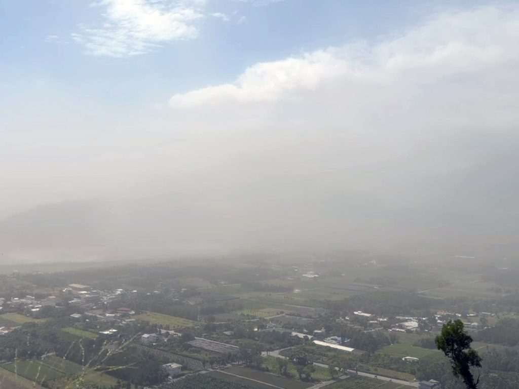 從高處望向花東縱谷公路與鹿野鄉市區,整片地區宛如籠罩在濃霧中,開車視線不良,市區更是沙塵漫天。騎機車的民眾出門一趟回來,已是「灰頭土臉」,直呼「全身都是沙,真的很不舒服」,相當無奈。