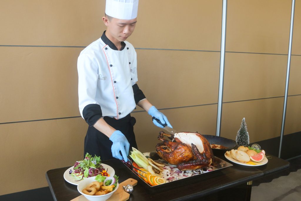 「感恩節火雞盛宴」由副主廚嚴選國外進口火雞,將重達6公斤的火雞融合多種香料醃製、爐烤,搭配經典蔓越莓及紅酒醬汁享用,清爽解膩!Cozzi THE Roof餐廳於11月1日至12月25日推出內用分享餐及外帶組合餐,內用除了享主廚桌邊現切火雞服務外,並精選兩道配菜增添風味,還有自助吧中西式料理吃到飽,每組4,899元起,前5名預訂貴賓可獲得價值1,000元以上的英國有機保養品牌「Neal’s Yard Remedies」體驗禮。