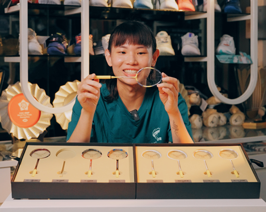 當戴資穎親自打開收藏盒,八支熟悉的球拍整齊排列於典雅的黑金禮盒中,映照出她職業生涯的縮影。被問及哪支球拍最有革命情感,戴資穎笑說:「好難選喔!我覺得應該是東京奧運時推出有我簽名跟蛇的(刺青圖騰)。」她凝視著每一支陪伴征戰的球拍,從初出茅廬的青澀,到世界之巔的榮耀,所有記憶在瞬間交織。