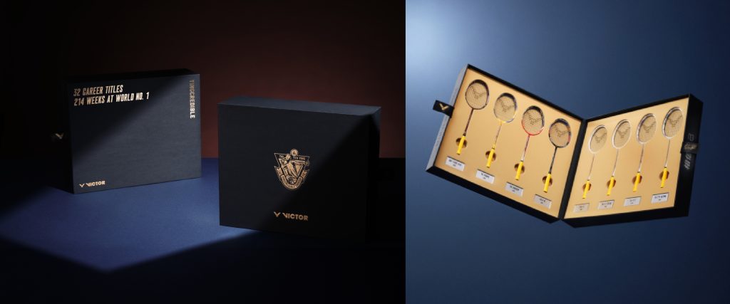 以典雅黑金為外盒設計,內襯以金色植絨襯托戰拍的尊榮質感。隨盒附上「戴資穎典藏球員卡」乙張,外盒鐫刻全球限量的專屬流水編號,其中更有50組戴資穎親筆簽名版隨機出貨。戴資穎歷代戰拍迷你收藏組即日起於 VICTOR經銷商、MOMO品牌旗艦館以及PCHOME旗艦館通路啟售。