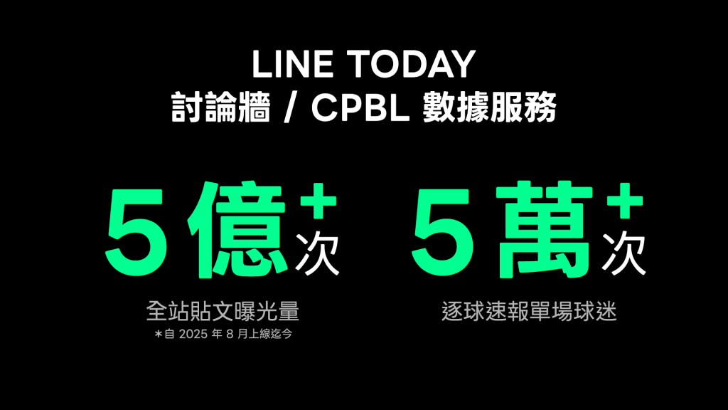 LINE TODAY 正式升級為互動式內容平台。8月上線的「討論牆」功能,將留言轉化為可匿名發表的「貼文」,截至今(22)日,累積曝光量已突破 5 億次。為提升交流品質與深度,平台導入「官方認證標章」以識別受邀的意見領袖;並利用「AI 貼文摘要」技術彙整多元觀點,促進更具包容性的公眾討論。同時,LINE TODAY 於今年7月為中華職棒推出「逐球速報」等數據服務,使用人數持續攀升,近期單場已超過5萬名球迷使用。