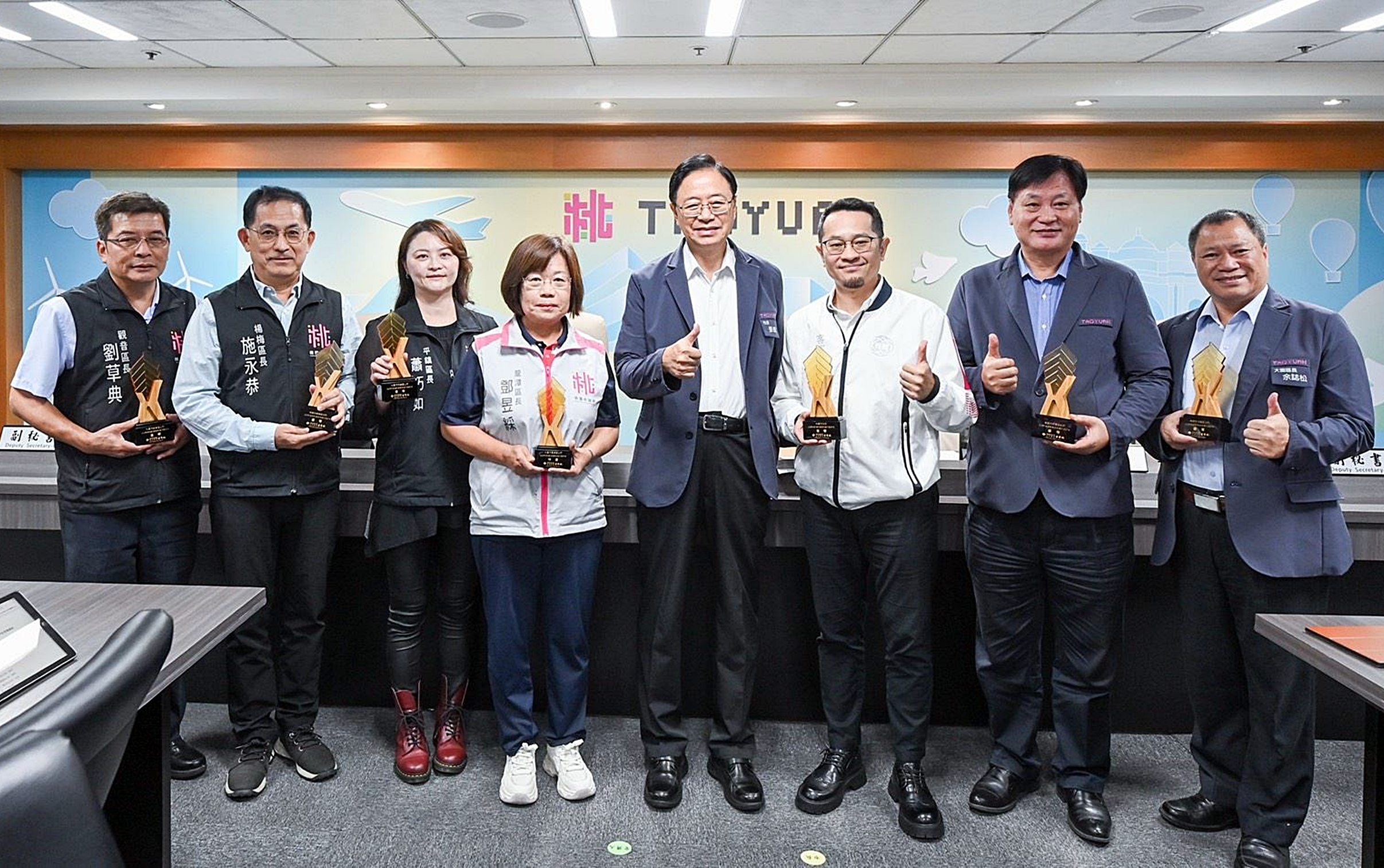 桃園市長張善政二十二日上午主持市政會議,接受客家事務局呈獻榮獲客家委員會「一一三年度推動客語為通行語執行成效」績優獎項。張善政表示,很高興客家事務局與多個區公所客語推動再獲肯定,感謝各單位積極投入客語推廣,不論是否站上頒獎台,大家都是共同努力的一份子,盼各單位持續攜手傳承、發揚客家文化。