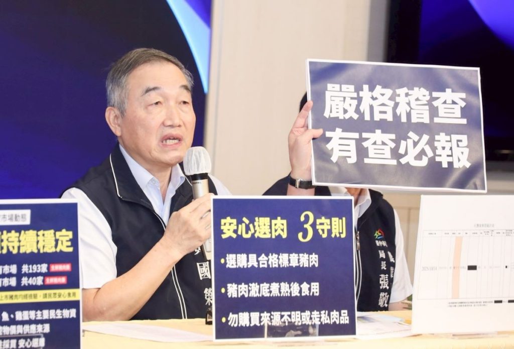 台中市首例疑似非洲豬瘟案例,台中市政府22日由市長盧秀燕二次召開緊急應變會議,23日由副市長黃國榮再次召開記者會,針對中市府農業局、經濟發展局、教育局、衛生局、環境保護局5局處因應作為向民眾說明,以「嚴格稽查,有查必報」原則把關豬隻,降低傳染病散播,共同守護市民食安。