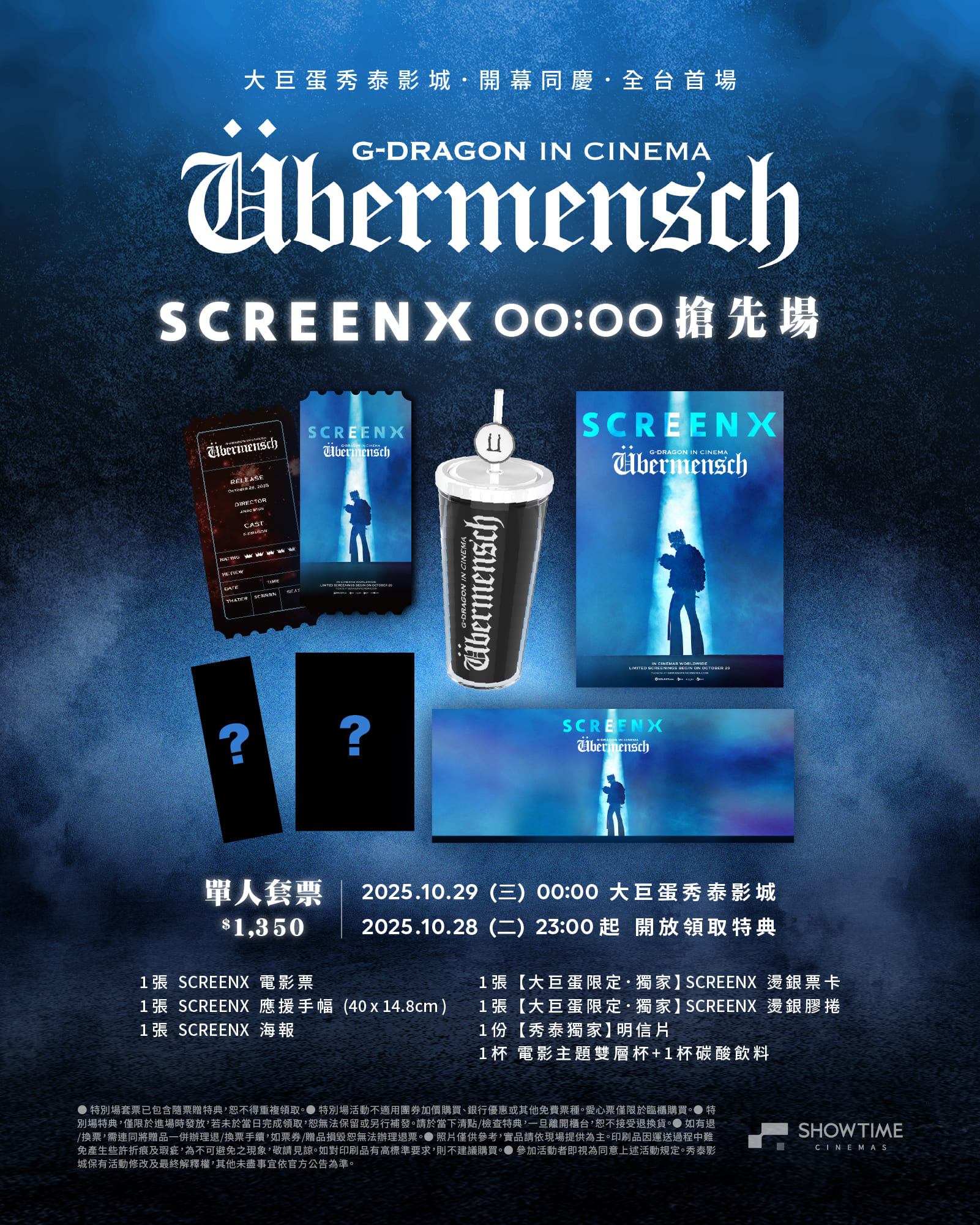 備受矚目的《G-DRAGON IN CINEMA [Übermensch]》將於10月29日午夜在大巨蛋秀泰影城率先登場,並同步推出ULTRA 4DX與SCREENX雙版本,帶來身歷其境、震撼全感官的極致體驗。凡於購買10月29日大巨蛋秀泰影城《G-DRAGON IN CINEMA [Übermensch]》電影票,還可參加抽獎活動,有機會獲得 G-DRAGON 2025 世界巡迴演唱會限量周邊,包含官方應援手燈「Day-G」與「盆栽造型手燈座」等珍藏逸品,為粉絲留下獨一無二的傳奇印記。