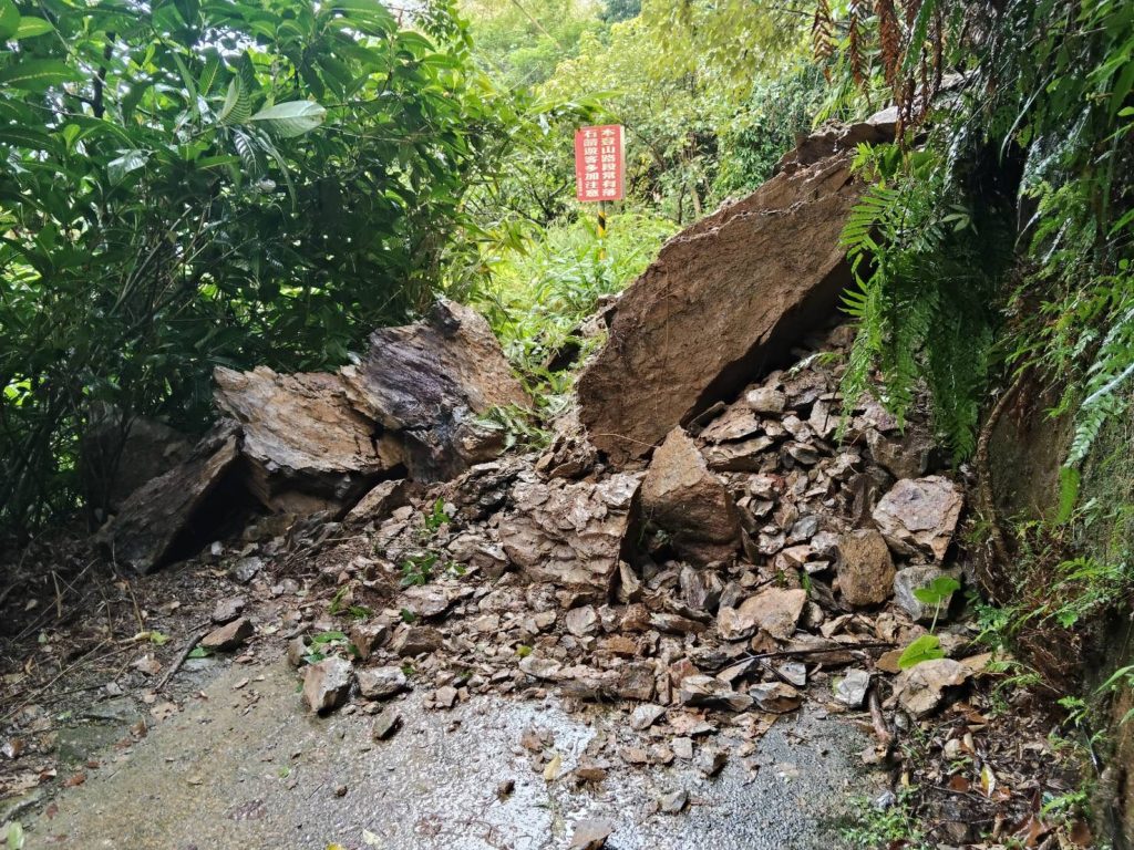 工旅處指出,受到風神颱風外圍環流與東北季風共伴影響,連日豪雨不斷,引發五峰旗瀑布下層瀑布區邊坡坍方,巨大落石阻斷步道,目前上、下層瀑布區都要整修復建,全區步道都不能走,為遊客安全,已全區封閉。