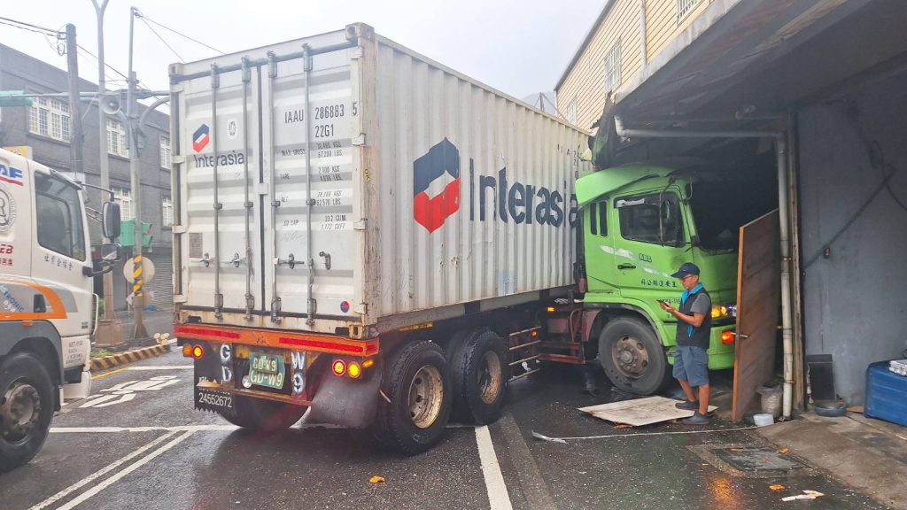 宜蘭縣頭城鎮二十三日中午發生一起驚險車禍,一輛營業貨櫃曳引車疑似煞車系統卡死,失控直衝濱海路一棟民宅,撞破鐵門並波及一旁機車,所幸無人受傷。後方一名電動腳踏車騎士僅差四秒閃過,驚險畫面令人捏把冷汗。