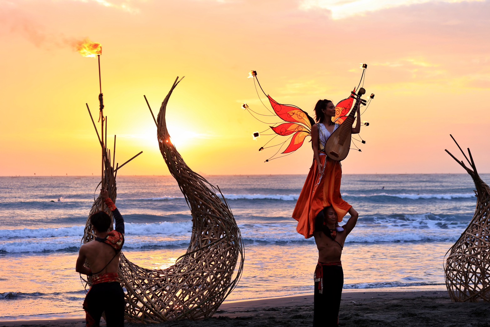 裝置藝術部分,有《光與海的相遇》,透過反光材質與光束投射,作品隨日落與火光變化,映照出漁光島海岸動態景致、《鯤焰之光》以金屬與火焰元素結合的大型裝置藝術,呈現鯤魚化火的想像意象還有動態裝置藝術,展現火舞人的人生軌跡。