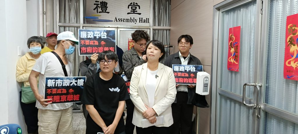 市議員鄭文婷二十三日下午四點,帶著支持者到市府大門,呼籲市府的廉政平台,不要淪為市府遮羞布。在市府廉政平台第三次會議召開前,到四樓禮堂開會現場,把陳情書交給廉政平台的委員後,在禮堂外喊口號後離去。