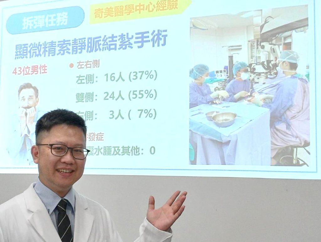 32歲林男多年來飽受左側陰囊反覆脹痛與下腹部悶痛之苦,吃止痛藥未就醫,因沐浴摸到左陰囊有異常腫塊鼓脹,理學檢查診斷為精索靜脈曲張,婚後年餘均未受孕,執行精索靜脈曲張顯微結紮手術疼痛消失,追蹤精蟲活力及數量明顯提升,解決疼痛與生育問題。