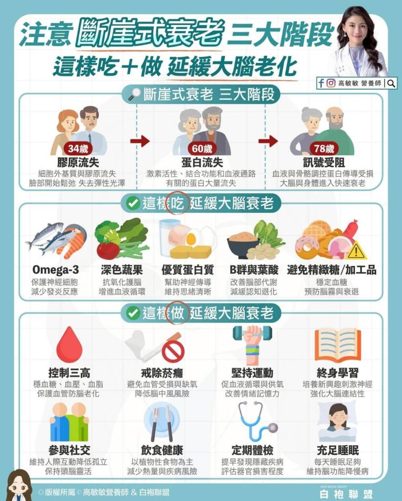 你有沒有發現照鏡子時,突然覺得皺紋變多了?健檢突然多了紅字!或是自己好像比以前更容易變胖、疲倦、生病,好像一下子老了好幾歲一樣,知名營養師高敏敏表示,其實老化每天都在發生,但研究發現有3個關鍵時間點會像「斷崖」一樣突然加速下滑。不過老化雖然無法避免,卻能靠飲食和生活習慣來延緩,只要平常做好準備,就能幫助大腦保持清晰、青春久一點。