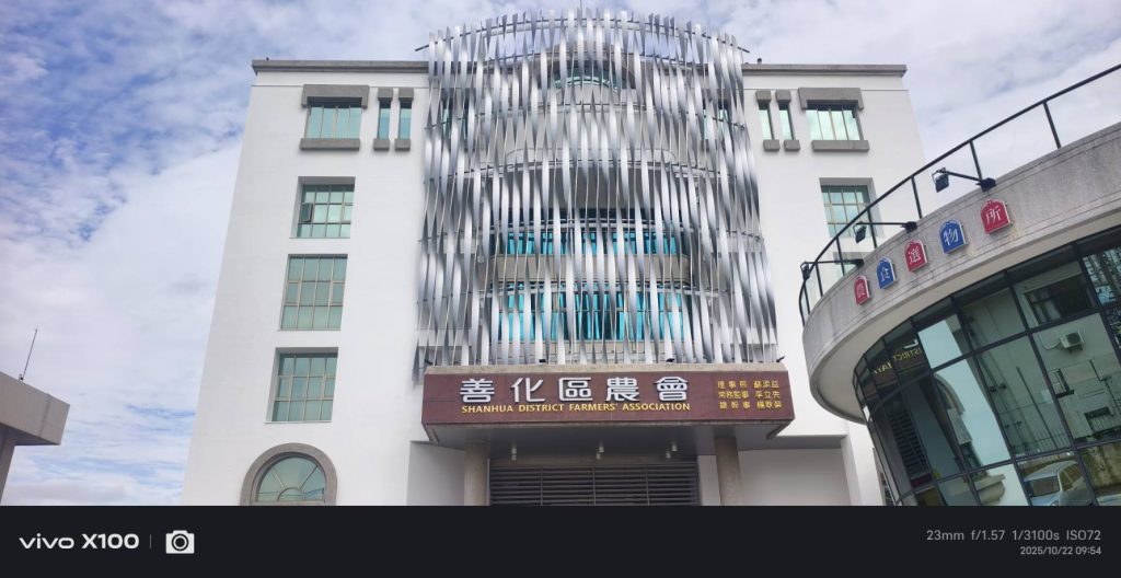 善化區農會大樓已逾三十歲了,近年來外牆磁磚嚴重脫落,有時還會險些誤傷行人,今年特自籌二千萬元,希望將外牆和門面大力整頓翻修,並期望趕上十一月胡麻節舉辦前完成。果然,大樓經設計整理上漆後,閃亮無比,以不鏽鋼創作的立面,在陽光下閃閃發光,如此大膽的不鏽鋼創作裝置藝術,如同「鐵甲武士」的防護罩,目前都已完工,而搭配著一旁如同小巨蛋的農會選物所建築,形成善化亮眼的特色地標,藉以迎接即將到來的胡麻節。