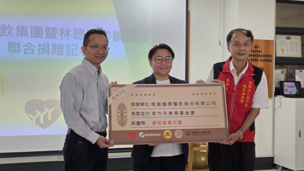 唯賀國際餐飲集團總經理吳家德24日於「若竹兒教育基金會」將聯名活動募集善款新台幣 66 萬元將象徵愛心的支票親手交付予「若竹兒教育基金會」代表,另同步捐贈予「安得烈慈善協會」,兩單位各獲贈 33 萬元。