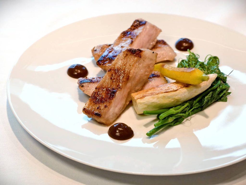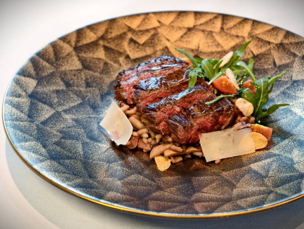 主菜最令人印象深刻是「火烤和牛橫膈膜 帕馬森起司 紅酒牛汁燉飯」,有趣的是燉飯絕妙口感,做法上將牛汁、炸蒜片爆香後炒製,半乾濕的滋味獨特,玫粉色牛肉入口即化,小火香煎鎖住肉汁再浸泡回血,出餐前以噴槍提升風味,略帶嚼勁米飯愈吃愈香,讓人回味無窮。對於不吃牛的人,貼心備有「盤克夏松阪豬 黑蒜檸檬醬汁」舒肥後煎至外表金黃,佐以黑蒜、炸蒜仁、洋蔥與白蘿蔔熬製醬汁,肉質厚實有彈性。