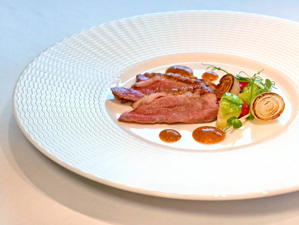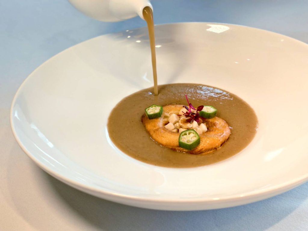 前菜由「脆皮櫻桃鴨胸 孢子橄欖 南高梅紫蘇醬汁」揭開序幕,鮮嫩鴨肉經低溫舒肥,小火慢煎至外皮酥脆,入口能嚐到淡淡焦香味,與鴨肉的柔嫩滋味,尾韻是紫蘇葉特製醬汁,酸中帶香很開胃。秋冬暖胃首選「蕈菇濃湯 螺旋酥餅 榛果碎」,強調不添加奶油,主廚Sam發揮巧思,取多種菇類熬煮,再加入馬鈴薯增添黏稠度,現場桌邊淋湯,熱騰騰濃湯香氣四溢,搭佐中央鏤空螺旋酥餅,翠綠色秋葵妝點,帶給舌尖全新層次感。
