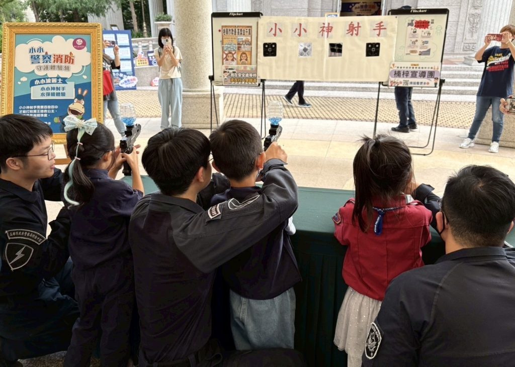 同時,保安大隊現場展演警察體能戰技,交通大隊則展示警用大型重機與水彈槍,消防局團隊設置「濃煙屋」與消防水線操作體驗,讓參與家庭親身感受警消工作的專業與辛勞,活動現場笑聲此起彼落,許多家長直呼「寓教於樂、收穫滿滿」。