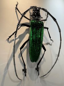 台中市墨海藝術協會理事長廖迎晰,最新個展《演化的寓言》共展出10件立體作品,延續其一貫的創作脈絡,關注環境議題與人類生存法則,開啟一場橫跨時代的對話;從古老權力象徵的戰馬、融化的紅龜粿,到被電路紋理包裹的綠色天牛,串聯出人類文明從「進化」到「變異」的詩性旅程,充滿科技感,前衛且時尚,備受關注。