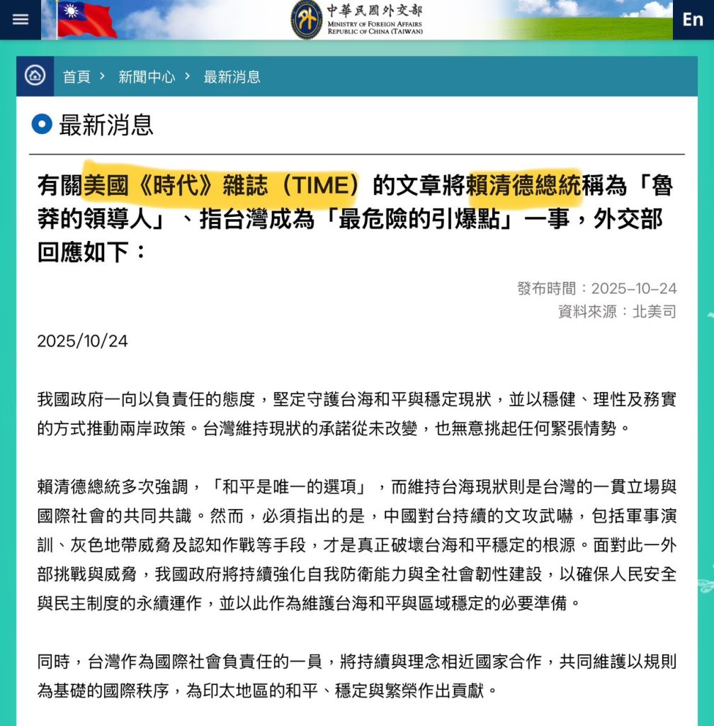 結果很快在兩個月後,《時代》雜誌(TIME)刊登高德斯坦(Lyle Goldstein)教授所撰稿件,此次矛頭直指賴清德,而且措辭更是讓人難以招架;當初美國前官員以負面言辭批評蕭美琴女士時,政府任人訕笑政要,如今報應來得真是又快又猛。