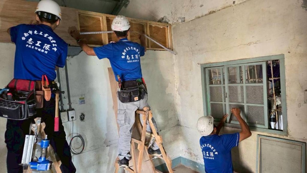 勞工局安排多個工會協作修繕,由電氣業職業工會志工負責斷電作業、泥水業職業工會進行平房與樓房拆除;電子機械加工職業工會協助搭設平房屋頂,並由連景公司提供施工架支援,確保修繕工作安全順利進行。