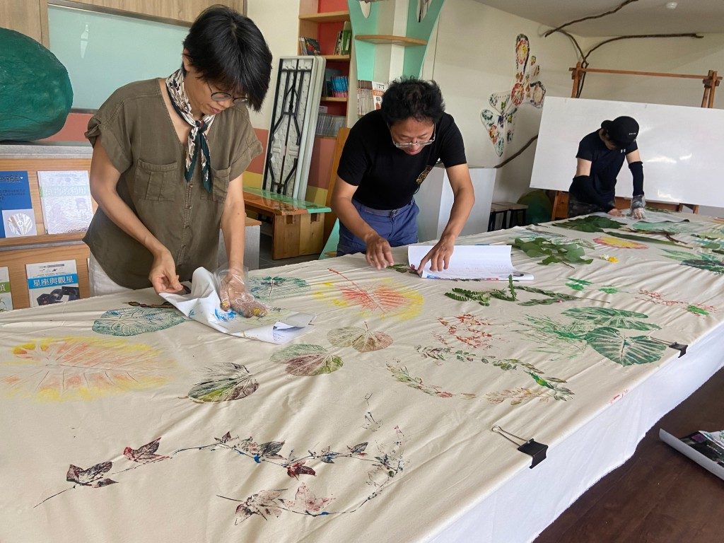 一早大家就一起到故事館附近採集植物,不論是藤或是葉或是花,都是很好的素材,吳美靜表示,淺山的植物相當多元,有大大的葉子,有細細的藤,還有可愛成串的小花朵,拓印在布幔上就有其美麗的姿態,變成一幅獨一無二的圖案,再加上自己親手調出的五彩顏色,不論是黃加紅的金紅,或者是紅加白的粉粉色,還是綠加黑的獨特顏色,都是很好的創作。