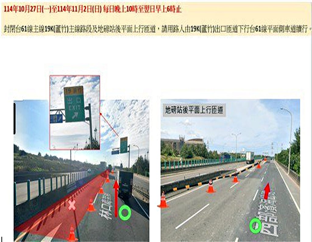 北區養護工程分局二十六日表示,管制方式如下:一、封閉台六十一線主線十九K(蘆竹)主線路段及地磅站後平面上行匝道,請用路人由十九K(蘆竹)出口匝道下行台六十一線平面側車道續行。