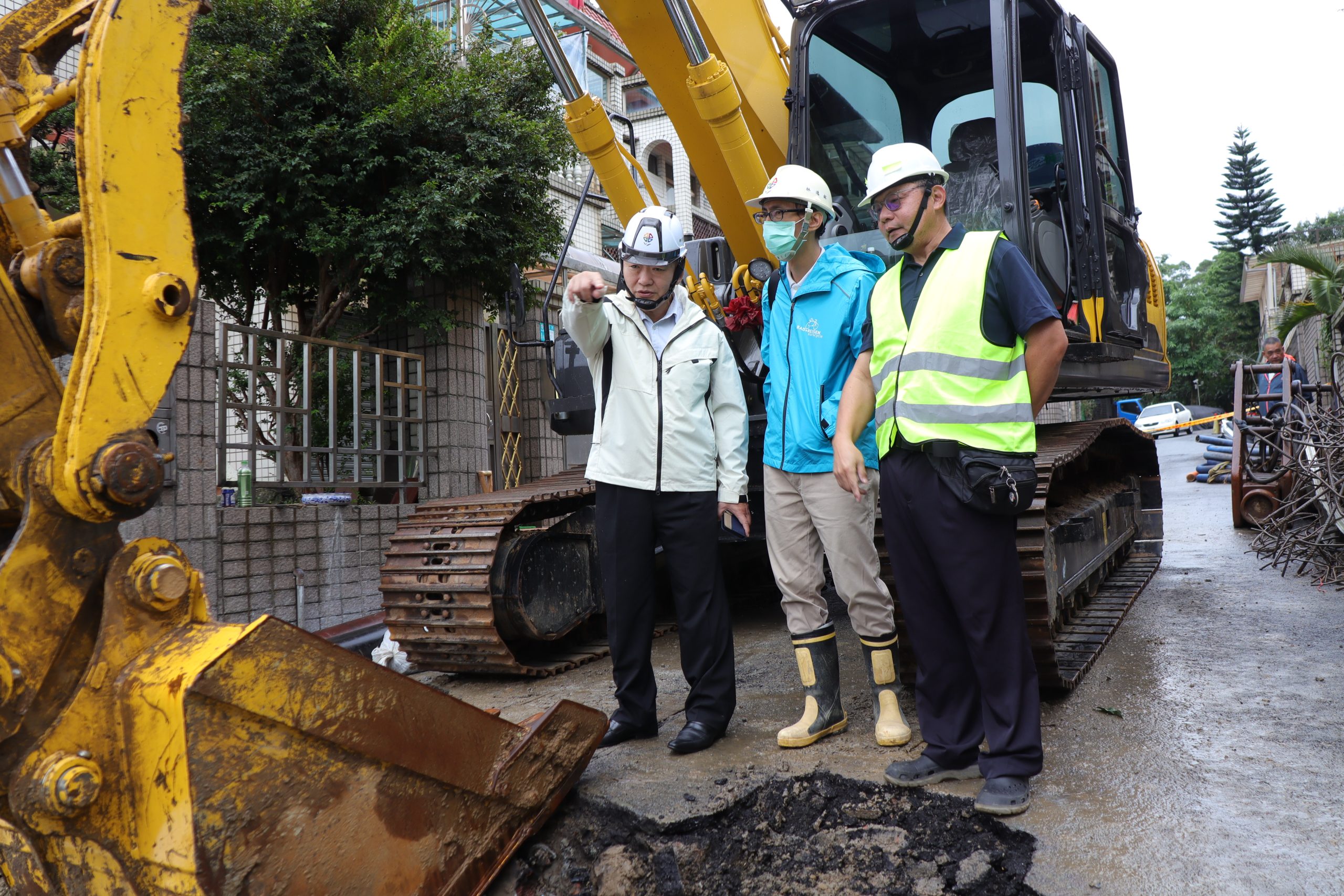 新北市工務局長馮兆麟(左一)到場視察新店錦繡、碧瑤社區擋土牆坍塌的搶災工程進度。(新北市工務局提供)