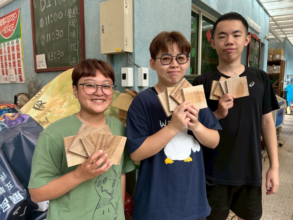 在學校經費有限的情形下,新埔茂林木材行老闆宋錦森義務相挺,協助作木材運輸與切片,再由玄奘大學三位同學張皓翔、張馨云、鄭淨方所組成的林林藝創團隊負責進行研磨和裁切,10/27製作完成200片精美的木製杯墊。