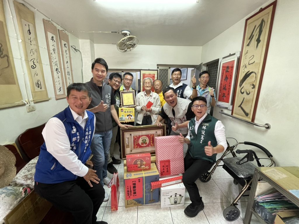 永康區長李皇興二十七日偕同議員、里長等造訪初滿百歲的人瑞,並致贈每位人瑞長者總統府與衛福部聯名的金鎖片、總統府敬老狀、市府祝賀金一萬元、匾額、禮品,獻上祝賀與關懷,祝願長者們平安健康呷百二。