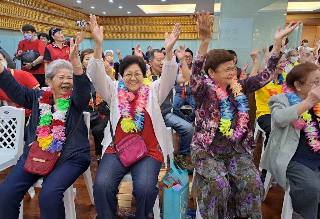 佛光山三重禪淨中心重陽敬老活動中,長輩跟著老師一起動健康非常開心。(記者吳瀛洲攝)