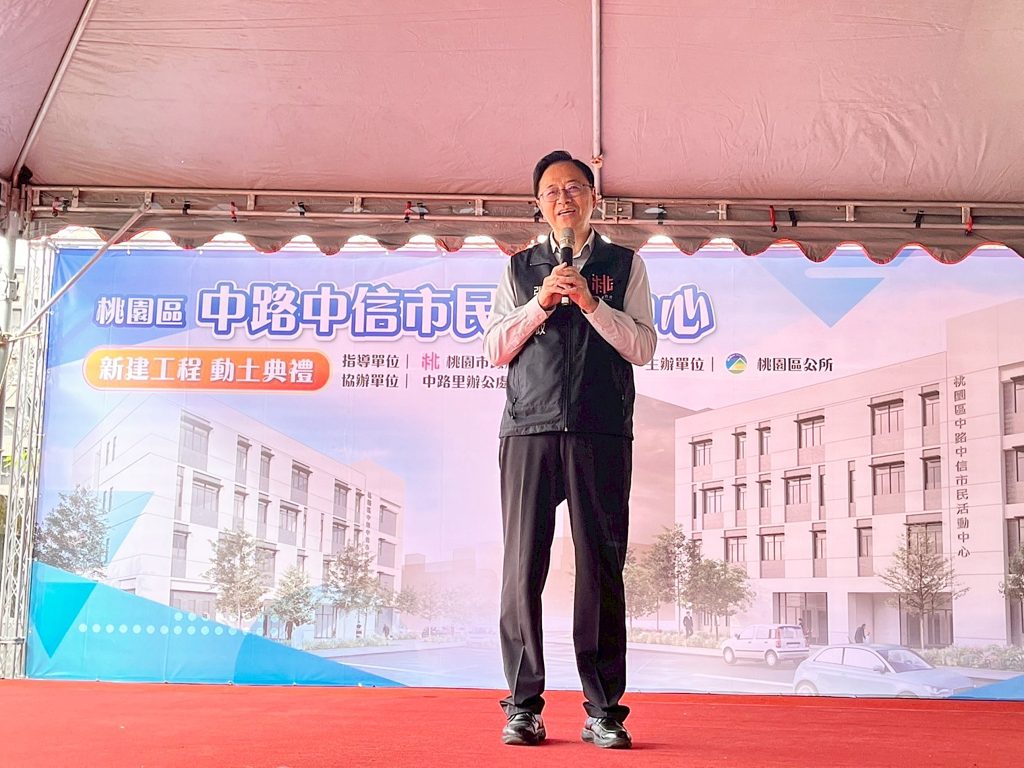 桃園市長張善政二十七日出席「桃園區中路中信活動中心」開工典禮。張善政指出,由於近幾年桃園區人口增加,需積極推展及興辦各項社會福利措施,以提供市民朋友更優質的生活環境,因此與民眾息息相關的區里建設更是刻不容緩,為了提供民眾更好的居住環境,市府特別責成相關局處及公所規劃相關建設,以建立優質居住生活環境。