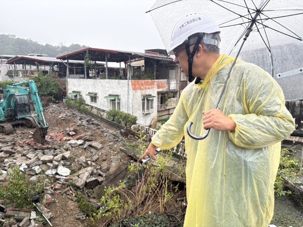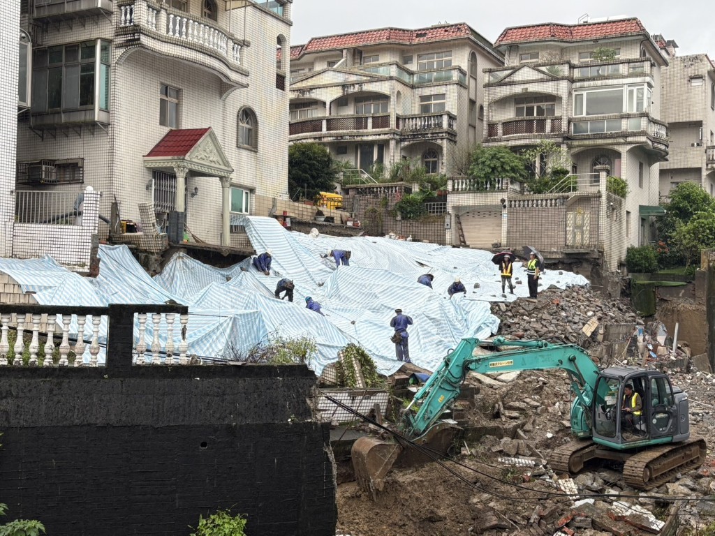 新北市工務局長馮兆麟指示搶災團隊做好整備及應變資源。馮兆麟表示,今日會在擋土牆上方接設水管引流,邊坡也覆蓋土方與帆布,減少雨水滲入擋土牆,並利用雨間隙空檔加速邊坡搶災工程。市府掌握天候及監測數值變化,一切以社區居民安全為優先,提早積極應對,守護民眾家園安全。