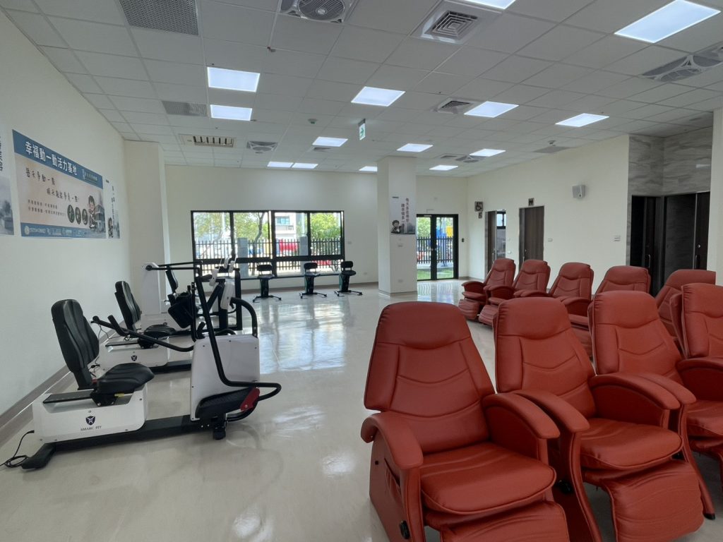 中心內導入多項AI智慧照護設備,由比翼生醫整合宇康醫電、先進醫資與維思感創等廠商技術,共同打造「智慧健康照護平臺」。現場設置的趣味手搖車設備,結合電玩互動概念,讓長者能以遊戲方式進行復健訓練,機器會根據長者體能數據與運動反應,透過AI自動生成個人化運動處方,調整訓練強度並記錄成效。同時設有智慧健康管理站,可即時監測血壓、心率等生理數據,並上傳至雲端平臺供護理團隊追蹤分析。針對夜間照護,導入「icue智慧感測墊」,能在長者離床三秒內即時警示護理站,預防跌倒與意外發生。這套系統不僅能偵測活動狀態,也會同步記錄呼吸率與睡眠狀況,協助照護團隊提供更精準的護理服務