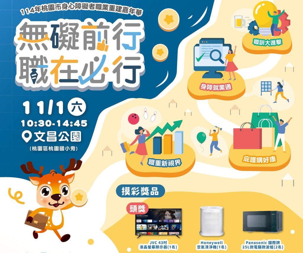 為推廣身心障礙者就業服務資源,並展現職業重建豐碩成果,桃園市政府勞動局將於一一四年十一月一日(星期六)上午十時三十分,在桃園區文昌公園(桃園國小旁)舉辦「無礙前行,職在必行」身心障礙者職業重建嘉年華活動。