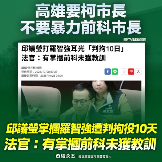 張永杰指出,美濃大峽谷選區立委邱議瑩,去年五月在國會打立委羅智強耳光,日前民事官司遭台北地院判決需賠償羅智強廿萬元,而刑事方面,檢方認定邱議瑩涉犯強暴公然侮辱罪嫌,對邱議瑩聲請簡易判決,經台北地院判決拘役十日,得易科罰金。