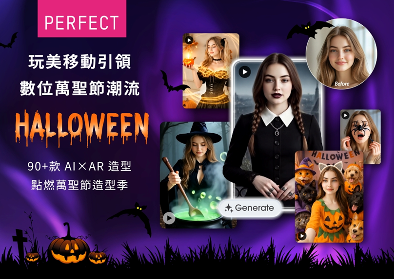 玩美移動(Perfect Corp.;NYSE: PERF),全球領先的 AI 與 AR 美妝時尚科技公司,宣布推出 2025 年萬聖節主題活動,旗下五大熱門App:玩美彩妝(YouCam Makeup)、玩美相機(YouCam Perfect)、玩美 Video(YouCam Video)、玩美AI修復(YouCam Enhance)與玩美 AI 繪圖(YouCam AI Pro),聯手推出超過 90 款 AI 與 AR 主題造型、虛擬角色與創作濾鏡。