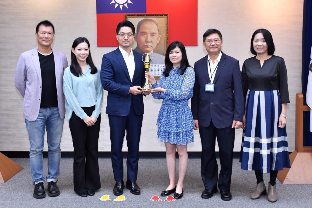 第60屆廣播金鐘獎藝術文化節目獲獎主持人施賢琴向市長蔣萬安獻獎,觀傳局長余祥(左二)、文化局長蔡詩萍(左一)、台北電台胡紹謙(右二)及中山堂管理所主任江孟芳(右一)共同出。(記者王誌成攝)