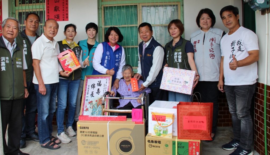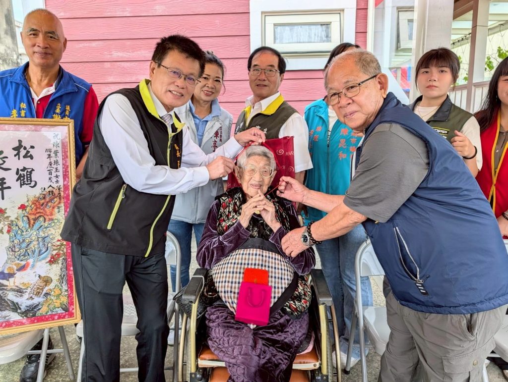 張明寶代表致贈總統府與衛生福利部聯名的金鎖片與敬老狀、市府一萬元紅包及賀禮,議會準備電鍋與立扇,並為人瑞掛上金鎖片,並與家人親切話家常,場面溫馨熱鬧、笑聲不斷。