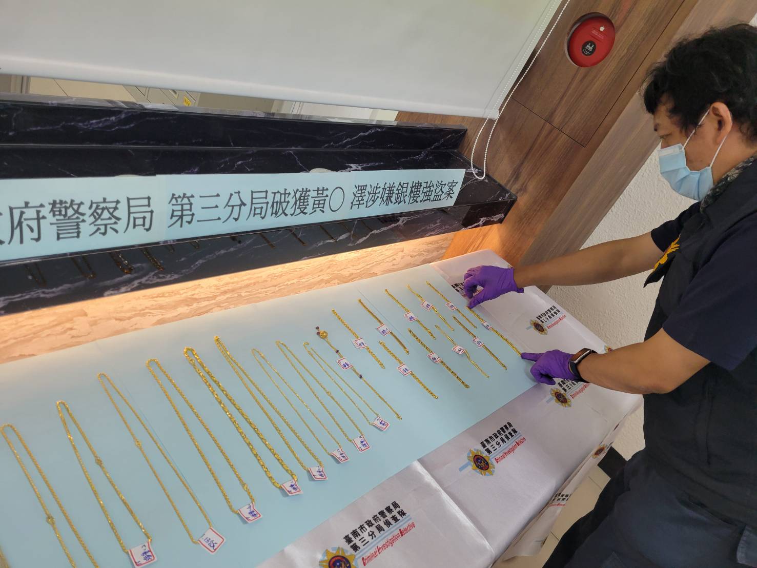 安南區廿七日驚傳銀樓搶案,歹徒以鐵鎚砸破玻璃後,搶走一批約十三兩金飾逃逸。市警三分局當晚將卅多歲的黃嫌查緝到案,黃嫌一度拒絕透露贓物下落,警方廿八日突破其心防,找回失竊金飾,後續將黃依強盜罪嫌移送法辦。