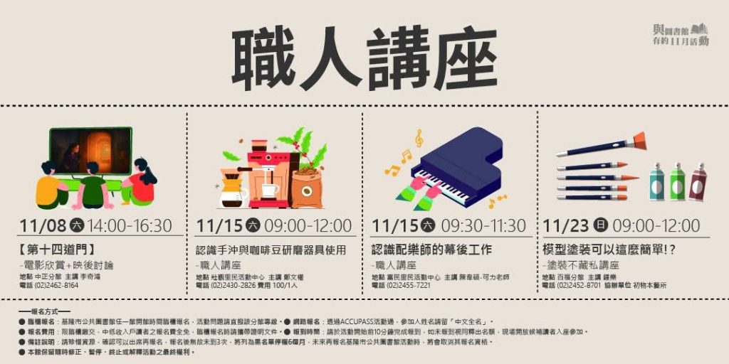 為推廣多元閱讀風貌,基隆市公共圖書館推出十一月「職人講座」系列活動,串聯中正、安樂、永平及百福等分館,邀請在地職人與專業講師,帶領民眾從電影、咖啡、音樂到模型塗裝等不同主題中,探索創作與美感的日常。