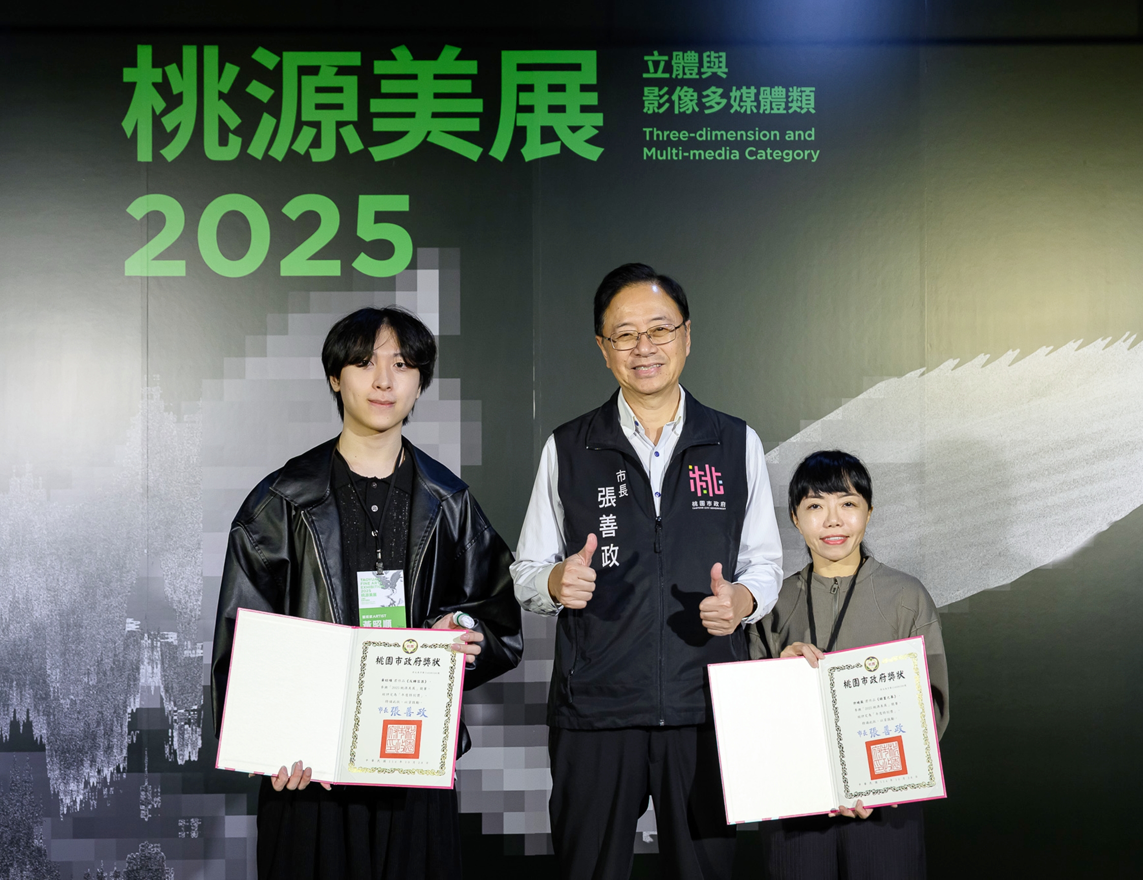 桃園市長張善政二十八日出席「二0二五桃源美展」頒獎典禮暨記者會。張善政表示,隨著科技與人工智慧快速發展,藝術創作邊界持續重新定義。今(一一四)年美展以「立體與影像多媒體類」為主題,涵蓋「立體造形」、「攝影與錄像」及「科技新媒體」等多元創作形式,鼓勵藝術家勇於探索新媒材與創作手法,展現藝術與科技融合的前瞻視野,期盼藉此激發更多具創意與實驗精神的作品,拓展當代藝術更多可能。