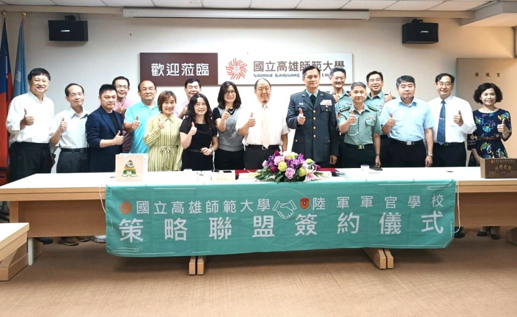 為促進學術與文化交流、推動科技創新研發,國立高雄師範大學與陸軍軍官學校二十九日在高師大和平校區,簽署「策略聯盟合作協議書」,由副校長唐硯漁與陸軍官校教育長黃孫德昌代表簽署,雙方主管團隊共同見證,象徵兩校攜手開啟全新的合作里程碑。