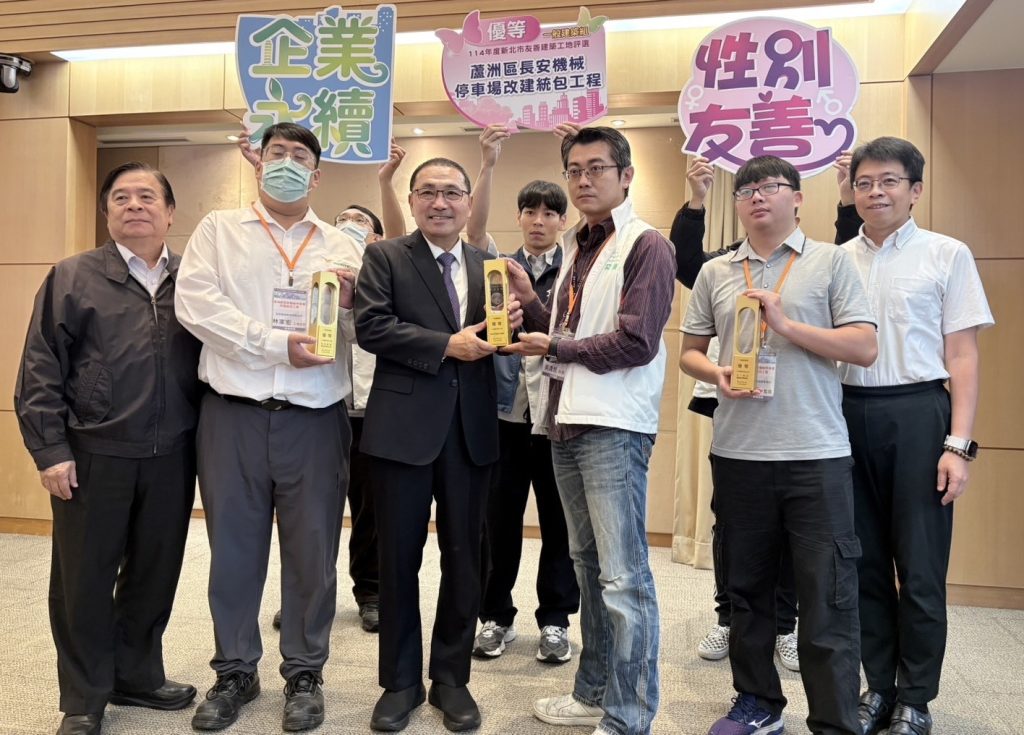 蘆洲長安立體停車場工程榮獲「新北市友善建築工地」一般建築組優等,新北市長侯友宜二十九日頒獎予以肯定。(記者蔡琇惠攝)