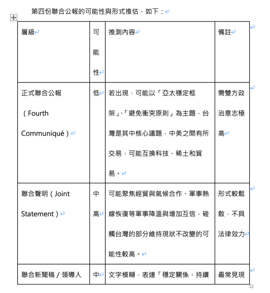 由於前三份公報都誕生於中美關係的歷史斷層,1972破冰、1979建交、1982修補,都是一個結構性轉折的關鍵節點。而2025年的中美關係雖對立激烈,但尚未到「需要一份公報重構關係」的臨界點雙方目前更傾向於「戰略管理」而非「制度重建」。因此,短期內(此次川普亞洲行)出現正式「第四份中美聯合公報」的可能性極低,但是無法不認為雙方正在醞釀中,而且內容一定會關涉台灣。因此,若2026年之後,美中能在台海緊張與科技、稀土議題掛勾和達成交易,上道某種「新型穩定架構」,那才可能孕育出真正的「第四份公報」。性質可能不會是這一次川習會的「友好聲明」,而是戰略競爭的安全管理條約化文件。