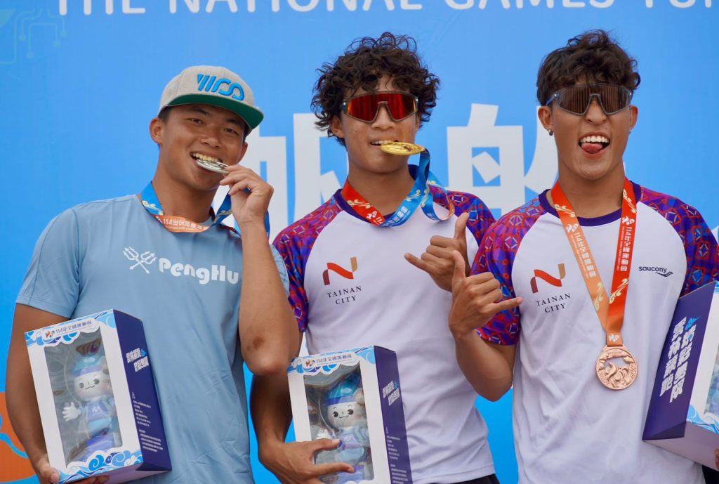 南大學士班三年級莊九為(中)在男子帆船風箏浪板水翼型掄元。(南大提供)