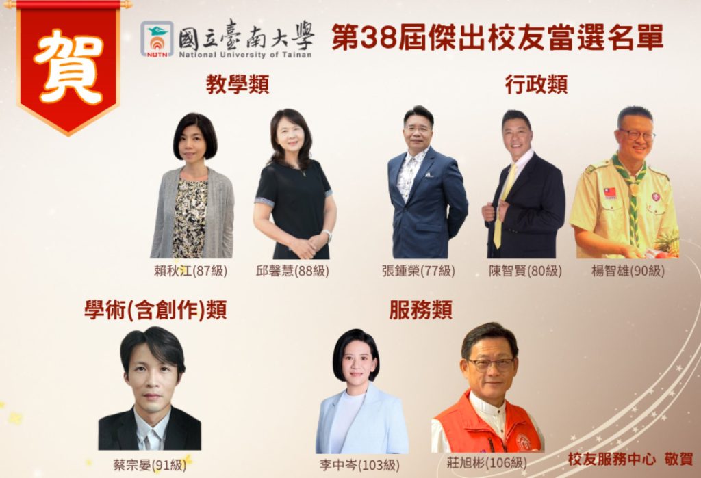 國立台南大學公布第三十八屆傑出校友,共分四類、八位獲獎者,分別為教學類賴秋江、邱馨慧;行政類張鍾榮、陳智賢、楊智雄;學術類蔡宗晏;服務類李中岑、莊旭彬。八位校友將於十二月十三日南大一二七週年校慶接受表揚。