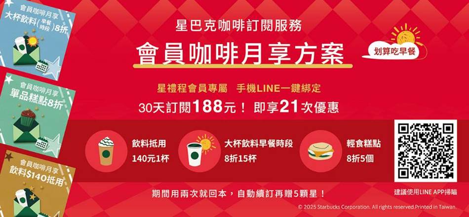 相聚時刻,別錯過星禮程會員專屬的咖啡訂閱服務【會員咖啡月享方案】,30天訂閱僅付188元,即享飲料/糕點等21次優惠,續訂成功還加贈5顆星!先訂閱再使用優惠,品嚐美味的耶誕新品,享優惠也享贈星,快打開星巴克LINE官方帳號之咖啡訂閱服務,一探究竟。